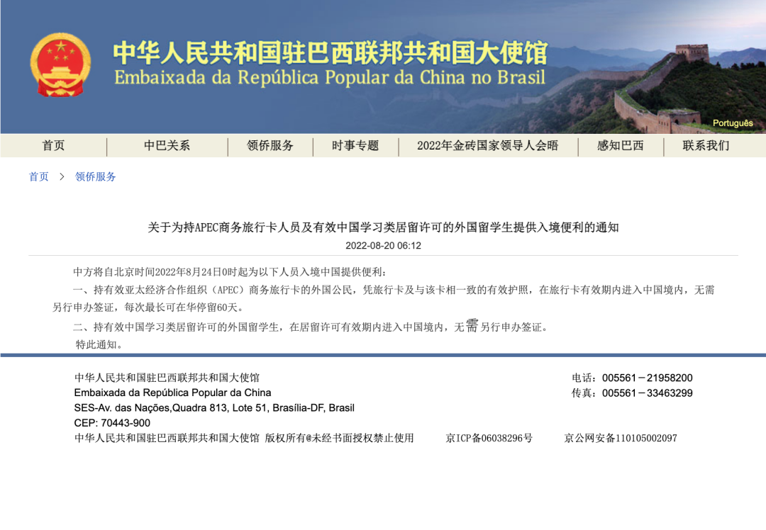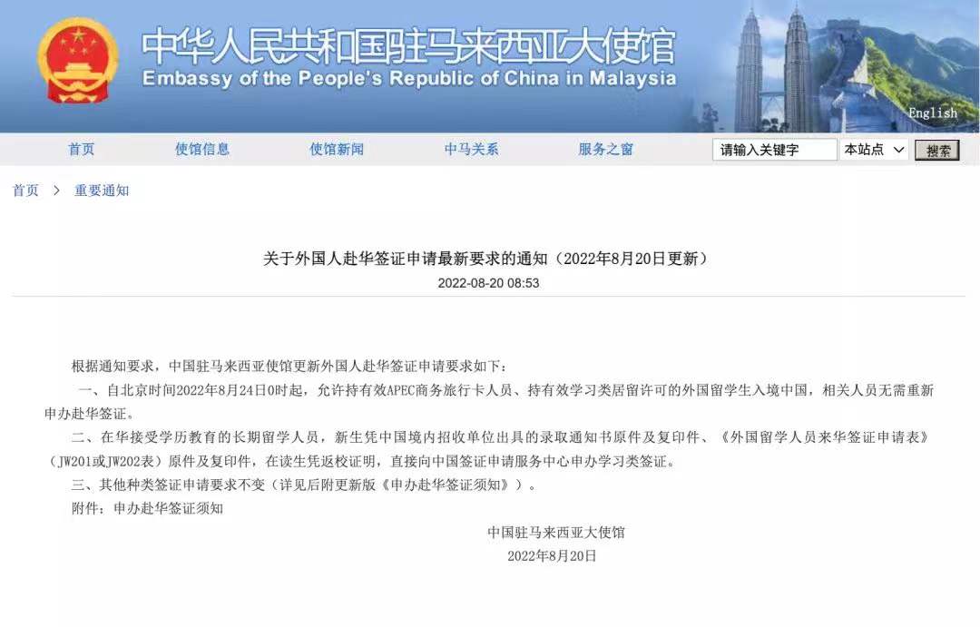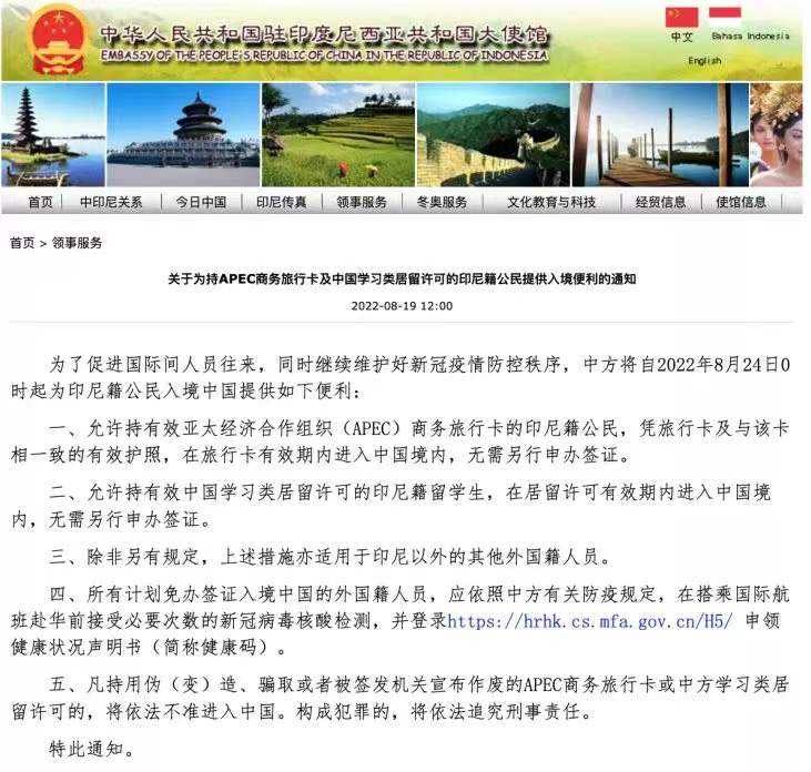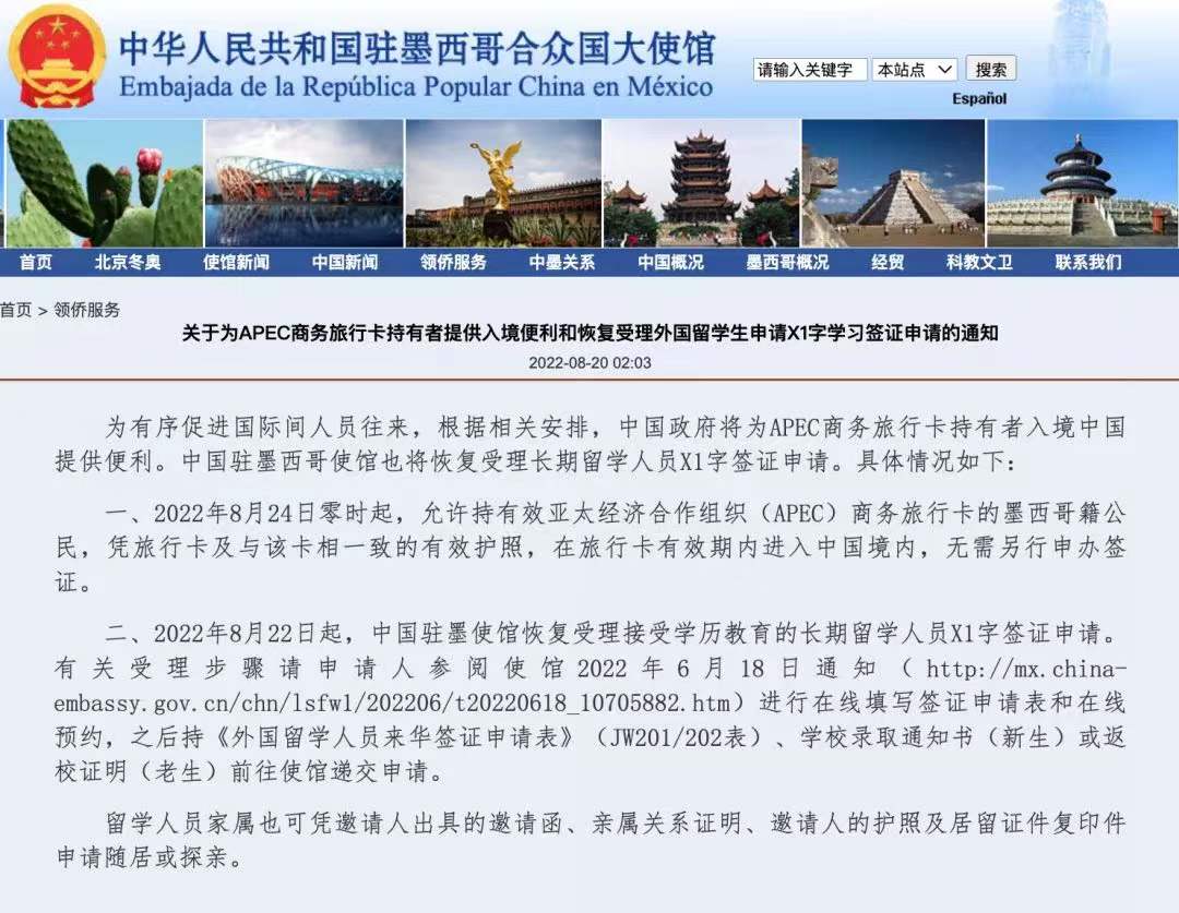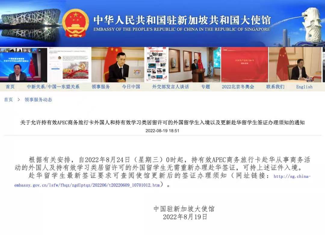 近日,“北京外事”关注到我驻巴西、马来西亚、墨西哥、泰国、新加坡、印度尼西亚等大使馆相继发布公告,进一步优化外国人来华签证政策。一是允许持有效亚太经济合作组织(APEC)商务旅行卡的外国人,凭旅行卡及与该卡相一致的有效护照进入中国境内,无需另行申办签证。二是持有效中国学习类居留许可的外国留学生,在居留许可有效期内进入中国境内,无需另行申办签证。这将进一步便利外国人入境来京。