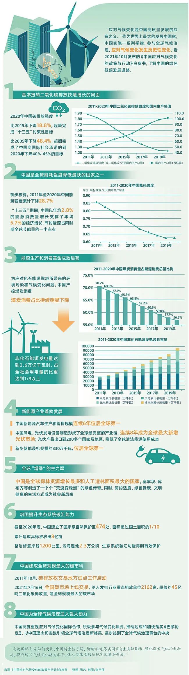 根据2021年10月发布的《中国应对气候变化的政策与行动》白皮书(以下简称白皮书),2020年,中国碳排放强度比2015年下降18.8%,超额完成“十三五”约束性目标,也超额完成了中国向国际社会承诺的目标。